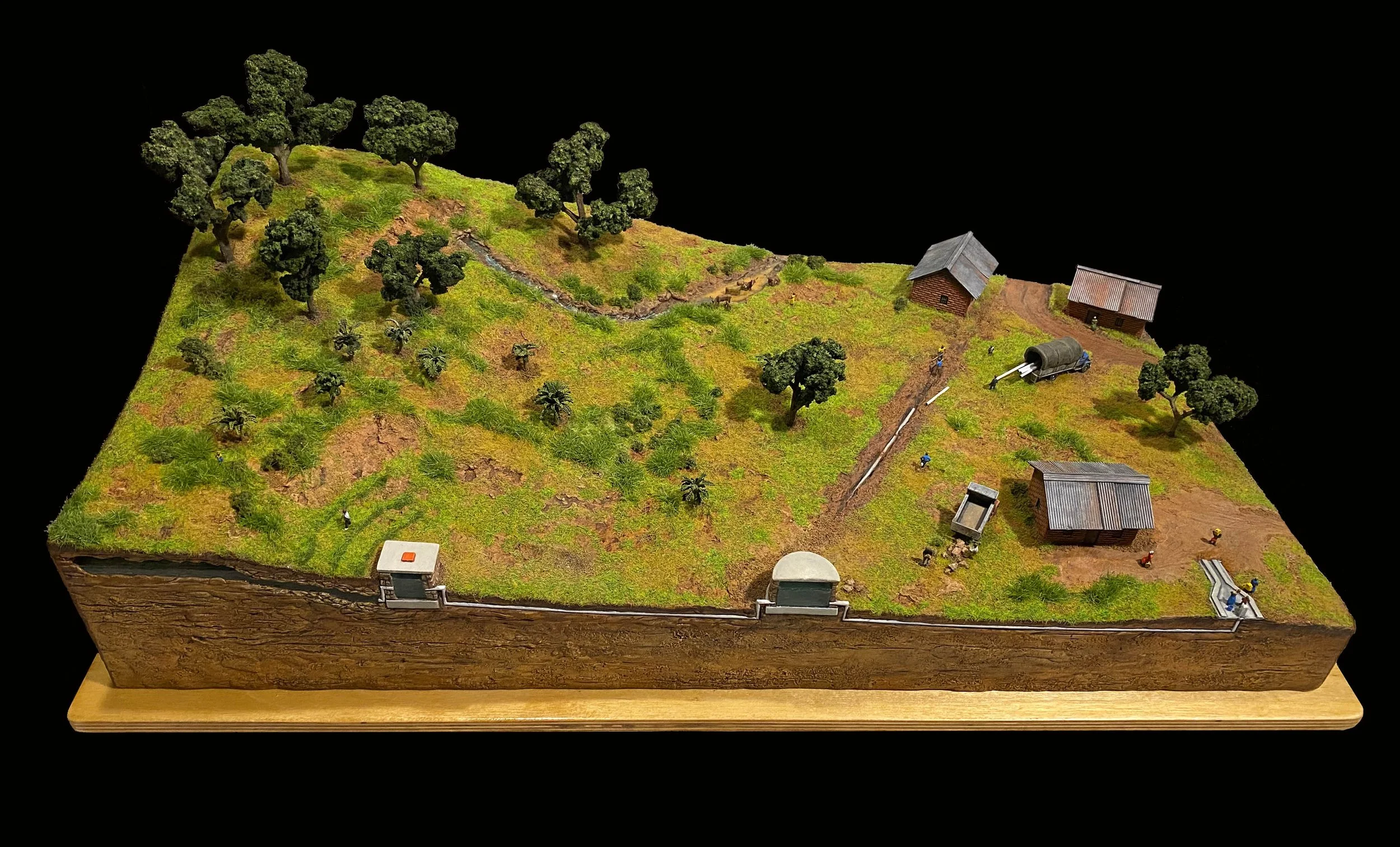 Created from insulation foam, epoxy putty, epoxy resin (water effect), styrene plastic (house and junk pile), commercially available N-scale people and tractor (with custom-built sprayer), model railroad foliage and grasses.